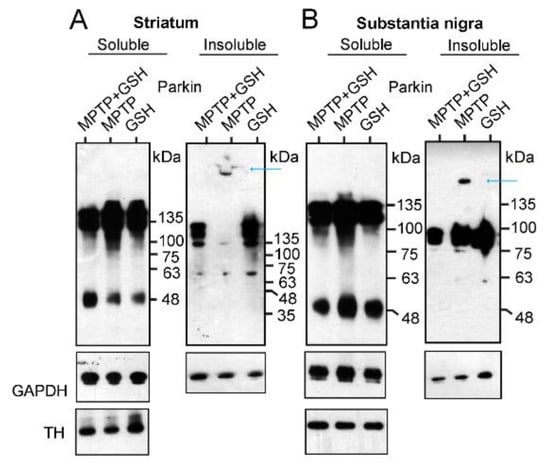 After treating the mice with 1-methyl-4-phenyl-1,2,3,6-tetrahydropyridine (MPTP), glutathione (GSH), or MPTP plus GSH, tissue samples from the striatum and substantia nigra were collected and separated into Triton X-100 soluble and insoluble fractions for the WB analysis. In the WB of the soluble fractions of the striatum (Figure 4A) and substantia nigra (Figure 4B), the ratio of intensity of the Parkin dimer to GAPDH (dimer: GAPDH) in MPTP-treated mouse brains was higher than that in mice treated with either GSH or MPTP plus GSH {MPTP plus GSH: MPTP: GSH = 1.0:1.8:1.1 in the striatum; 1.0:1.2:1.1 in the substantia nigra (analyzed by Image J, NIH, USA)}. Interestingly, in the WB of the insoluble fractions of the striatum and substantia nigra in MPTP-treated mouse brains, an extreme HMW of Parkin aggregations was detected compared to those of Parkin oligomers (blue arrows in Figure 4A,B). In particular, some MPTP-treated mouse striata were stuck in the comb space of the gel (Figure 4A).