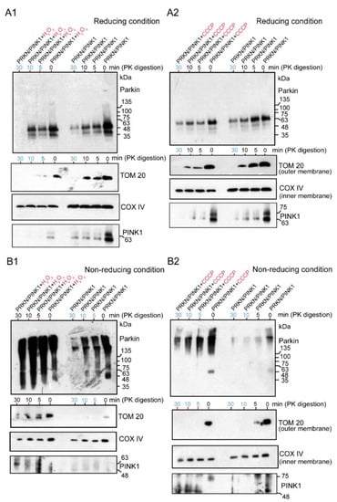 HEK cells were transfected with untagged Parkin and FLAG-PINK1. After 24 h, cells were treated with CCCP (20 μM for 6 h) or H2O2 (20 mM for 30 min), then were collected and processed for mitochondria isolation. Samples of the mitochondrial fraction were treated with proteinase-K over time (0, 5, 10, 30 min) and finally utilized for WB analysis using an anti-Parkin antibody or other antibodies (TOM20, COX IV, and PINK1). The blue numerals indicate the presence of only the inner membrane after degradation of the outer membrane. (A1): the samples (H2O2-treated Parkin) were loaded under the reducing condition. (A2): the samples (CCCP-treated Parkin) were loaded under the reducing condition. (B1): the samples (H2O2-treated Parkin) ware loaded under the non-reducing condition (no boiling and no reducing agent in loading dye). (B2): the samples (CCCP-treated Parkin) were loaded under the non-reducing condition.