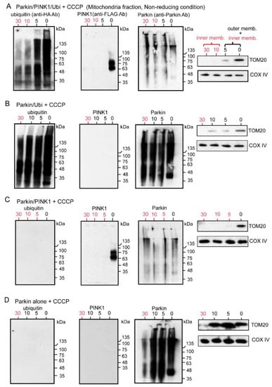 2.4. WB Analysis of Mitochondrial Subfractions after CCCP Exposure to Cultured Cells Overexpressing Various Combinations of Un-Tagged Parkin, FLAG-PINK1, and HA-Ubi, Which Was Performed under Non-Reducing Condition