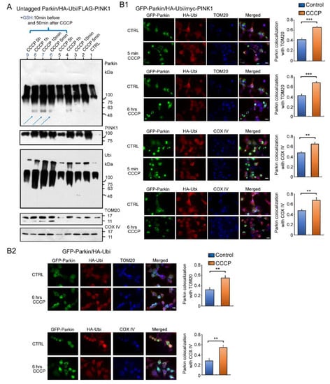 Western blot and fluorescent immunocytochemistry (ICC) of HEK cells overexpressing several combinations of plasmids. (A): HEK cells overexpressing untagged Parkin, HA-Ubi, and FLAG-PINK1 were treated with CCCP (20 μM) and collected at specific time intervals (5 min, 10 min, 1 h, 5 h) for WB analysis of mitochondrial fractions. WB analysis using anti-Parkin and other antibodies (for TOM20, COX IV, FLAG-PINK1, and HA-Ubi). Some samples were treated with GSH 10 min before and 50 min after CCCP administration (blue arrows). (B1): fluorescent ICC of HEK cells overexpressing GFP-Parkin, HA-Ubi, and myc-PINK1 and fixed 5 min and 6 h after CCCP administration. Anti-HA, anti-COX IV, and anti-TOM20 antibodies were used as primary antibodies. Graphs represent Parkin colocalization with a mitochondrial marker. (B2): Fluorescent ICC of HEK cells overexpressing GFP-Parkin and HA-Ubi, and fixed 6 h after CCCP administration. Graphs represent Parkin colocalization with mitochondrial marker. Scale bar 12 μm. *** p < 0.0001, ** p < 0.001.