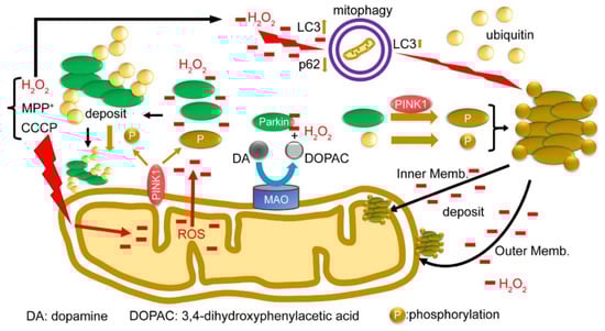 Finally, we present a functional model of the redox molecule Parkin in the mitochondria (Figure 8). When depolarization is triggered in the mitochondrial membrane, all the ions, proteins, and ROS in the mitochondria leak into or are exposed to the outer membrane. Parkin from the cytoplasm reacts with leaked H2O2 to aggregate and autoubiquitinate and non-specifically precipitates into both the inner and outer membranes. PINK1 is exposed to the outer membrane and phosphorylates Parkin and ubiquitin; however, even when phosphorylated, phosphorylated Parkin does not ubiquitinate the substrate, but rather leads to autoubiquitination and aggregation. Parkin is also presumed to react with H2O2 generated by MAO-A/B on the outer membrane, and eliminate H2O2, which may contribute to protecting the substantia nigra from cell death. In addition, H2O2 leaking into the cytoplasm directly stimulates mitophagy (Suppl-Figures S1 and S2). Parkin aggregates also positively modulate mitophagy (Suppl-Figures S1 and S2). Lastly, we attempted to use the SH-SY5Y cell lines other than HEK cells to characterize the behavior of the endogenous Parkin protein under oxidative stress. We have used SH-SY5Y cells since they express a sufficient level of endogenous Parkin and avoid artifacts that may occur in the experiments due to gene overexpression or cell line specificity. A Western blot analysis of mitochondrial fractions isolated from SH-SY5Y cells under non-reducing conditions showed bands of high-molecular-weight aggregates of endogenous Parkin upon CCCP exposure (Suppl-Figure S3A), which were ubiquitin-positive. By contrast, the same experiment was performed with the same specimens under reducing conditions, but a band of Parkin monomers was detected (Suppl-Figure S3B). WB analysis of this membrane, using an anti-Ubi antibody, showed vertical smears, indicating that the DTT in the loading dye degraded these Parkin aggregates to various ubiquitin-positive sizes.