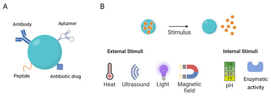 In addition to using ligands that specifically bind to bacterial cell receptors, stimuli-responsive nanocarriers that respond to physiological changes induced by bacteria can also be used to target infection sites. The most well-known endogenous stimuli-responsive systems for targeted MRSA therapy are pH-responsive NPs. In fact, MRSA infections are characterized by low pH at the site of infection [24]. Therefore, this feature can be used to design NPs that respond specifically to acidic environments [16]. Enzyme-responsive NPs have also been explored, as they can selectively react with enzymes specifically expressed in bacterial cells, leading to the targeted delivery of antibacterial agents. Exogenous stimuli-responsive NPs have also been proposed for the release of drugs in the desired tissue. In this approach, exogenous physical stimuli, including temperature, light, electricity, magnetic fields, or ultrasound, are applied to stimulate the release of drugs in the target tissue [25]. Figure 1B shows a schematic representation of stimuli-responsive NPs for drug delivery.