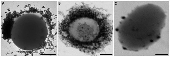Transmission electron microscopic images of (A) DNA aptamer-functionalized Au NP MRSA conjugate, (B) DNA aptamer-functionalized Au NR MRSA conjugate, and (C) DNA aptamer-functionalized Au NP E. faecalis conjugate. Scale bars correspond to 200 nm. Figure adapted with permission from [27].