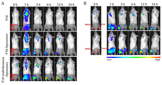 Near-infrared fluorescence images of (A) an MRSA-infected mouse model after tail vein injection of free P18; non-modified, P18-loaded liposomes; and maltohexaose-modified, P18-loaded liposomes and (B) an MRSA-infected mouse model with LPS infection or 4T1 tumor after tail vein injection of maltohexaose-modified, P18-loaded liposomes. Figure adapted with permission from [53].