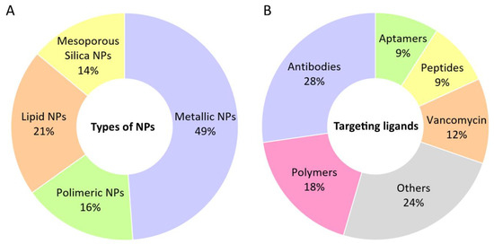 Graphical representation of the distribution of the types of (A) NPs developed for the targeted therapy of MRSA and (B) targeting ligands used for that purpose. This chart was generated based on the works included in this review.