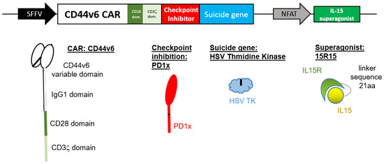 Design of a novel CD44v6 CAR vector. A novel lentiviral CAR vector specific for CD44v6 was designed. The vector includes checkpoint inhibition and an IL-15 superagonist expressed under the control of an NFAT-responsive promoter. In order to be able to eliminate CAR-expressing cells, we have included a suicide gene (HSV thymidine kinase; HSV TK). CD44v6 CAR, checkpoint inhibition and HSV TK are under the control of the constitutive SFFV promoter and linked by 2A sequences.