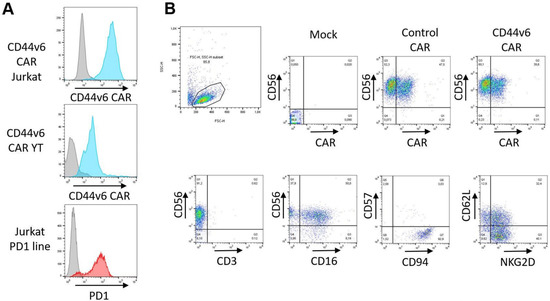 We introduced our vector by lentivirus transduction into reporter Jurkat cells [17]. The expression of the CD44v6 CAR was confirmed by flow cytometry and was comparable to expression after transduction of the unrelated gene PD1 (Figure 2A). Similarly, the NK cell line YT or primary NK cells from peripheral blood were transduced with a CD44v6 CAR vector or a control vector, which is identical but lacks the CD44v6 recognition site. Transduced primary NK cells showed expression of both CAR constructs (Figure 2B). The phenotype of transduced NK cells was maintained, with over 90% expressing CD56 and CD94 and less than 1% contaminating CD3 T cells. Approximately half of the NK cells expressed CD62L, indicating homing potential. The cells were not terminally differentiated, as indicated by low CD57 expression, showing replicative potential. Although the NK cells were not terminally differentiated, they had high functionality, as indicated by the expression of NKG2D (Figure 2B).