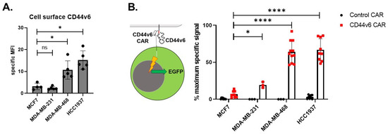Novel CD44v6 CAR efficiently recognizes CD44v6 expressed on breast cancer cell lines. Flow cytometry was used to test the level of CD44v6 expressed in breast cancer cell lines and the response of Jurkat reporter cells. (A) Flow cytometric evaluation of the surface expression of CD44v6 on 1 receptor-positive (MCF7) or 3 triple negative breast cell lines is shown, n = 5–10 biological replicates. Results are given as mean fluorescence intensity (MFI). Two-tailed unpaired t-test with Mann–Whitney correction was used to determine significance. Error bars represent the mean ± SD; * p < 0.05. (B) In order to validate our construct, we used Jurkat reporter cells encoding EGFP under the control of an NFkB promoter. These cells were transduced with CD44v6 CAR or a control construct lacking the CD44v6 recognition domain. Jurkat reporter cells were added to breast cancer cell lines on 96 well plates for 18 h at an E:T ratio of 1:1. The increase in GFP and Jurkat reporter cells upon exposure to breast cancer cells or stimuli was taken as specific CAR stimulation. Assay is depicted graphically in the left section of the panel. Results are shown as % of maximum stimulus (PHA 1 μg/mL) n = 3 biological replicates done in triplicate. **** p < 0.0001; * p < 0.05; ns not significant.