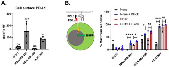 Checkpoint molecules do not inhibit novel CD44v6 CAR. In order to test the level of PD-L1 expressed on breast cancer cell lines and its effect on Jurkat reporter cells, we used flow cytometry. (A) Surface expression of PD-L1 on 1 receptor-positive (MCF7) or 3 triple negative breast cell lines is shown, n = 4–6 biological replicates. Results are given as mean fluorescence intensity (MFI). Two-tailed unpaired t-test with Mann–Whitney correction was used to determine significance. Error bars represent the mean ± SD. (B) In order to test checkpoint inhibition, we used reporter Jurkat cells expressing high levels of PD1, making them highly sensitive to checkpoint inhibition. These cells were then transfected with CD44v6 CAR (PD1x) or a CD44v6 CAR without checkpoint inhibition (none). After mock treatment or treatment with 10 μg/mL of pembrolizumab and atezolizumab for 1 h (block), cells were then incubated at a ratio of 1:1 with breast cancer cell lines for 24 h in 96-well plates. The increase in GFP and Jurkat cells, as determined by flow cytometry upon exposure to cells or stimuli, was taken as specific CAR stimulation. Assay is depicted graphically in the left section of the panel. Results are shown as % of maximum stimulus (PHA 1 μg/mL) n = 3 biological replicates done in triplicate. In the absence of vector-encoded checkpoint inhibition, breast cell lines with strong expression of PD-L1, such as HCC1937, showed low CD44v6-specific activation of Jurkat reporter cells. This was corrected either by vector-encoded checkpoint inhibitor (PD1x) or by the addition of pembrolizumab and atezolizumab (block), indicating it was due to checkpoint signaling via PD1. **** p < 0.0001; *** p < 0.001; * p < 0.05; ns not significant.