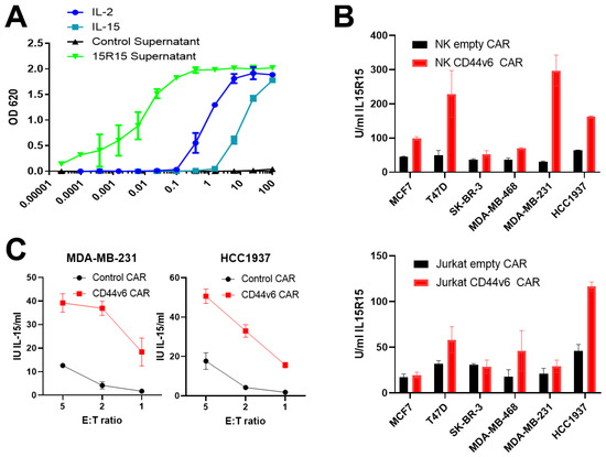 CD44v6 CAR stimulation induces production of IL-15 superagonist from NFAT promoter. In order to maximize stimulation of NK cells, we designed an IL-15 superagonist (15R15) controlled by an NFAT promoter. (A) In order to test the 15R15 molecule, we took supernatant from Hek293T cells transiently transfected with a plasmid encoding 15R15 under the control of a constitutive promoter. Addition of the supernatant to an IL-2/IL-15 responsive cell line showed strong stimulation (green line) equivalent to or superior to recombinant IL-2 or IL-15 (blue and turquoise lines). (B) Jurkat cells (upper panel) or primary NK cells (lower panel) were transduced with CD44v6 or a control construct lacking the CD44v6 recognition domain. Effector cells were added at a ratio of 1:1 to monolayers of target cells in 96-well plates. Supernatant was collected after 72 h and tested for IL-15 activity by bioassay. (C) Jurkat cells, as for B, were added to HCC1937 cells at different effector-target ratios. Supernatant was collected after 24 h and tested for IL-15 activity by bioassay. n = 3 biological replicates were performed in duplicate.