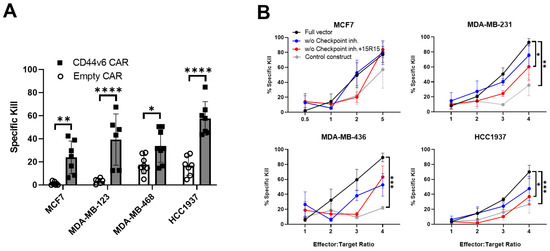CD44v6 CAR kills breast cancer cell lines in vitro. In order to test the functionality of the CD44v6 CAR, we transduced cell lines and primary NK cells with CD44v6 CAR vector. (A) YT cells transduced with CD44v6 CAR (black) or a control construct lacking the CD44v6 recognition domain (empty) were tested for cytotoxicity to BC. Effector cells were added at a ratio of 5:1 to monolayers of target cells expressing cell-associated nanoluciferase in 96-well plates and incubated for 18–24 h before supernatants were collected and assessed for luciferase, indicating cell lysis or kill. Results are shown as % of maximum kill (cellular lysis; triton X-100 1% in PBS) n = 3 biological replicates were performed in duplicate. (B) Primary human NK cells transduced with the full CD44v6 CAR vector (black) or with variants lacking checkpoint inhibition (blue), both checkpoint inhibition and IL-15 production (red) or control CAR vector (grey) were tested for cytotoxicity to 4 breast cancer cell lines, including 3 triple negatives. Effector cells were added at different ratios to monolayers of target cells expressing cell-associated nanoluciferase in 96-well plates and incubated for 8 h before supernatants were collected and assessed for luciferase, indicating cell lysis or kill. Results are shown as % of maximum kill (cellular lysis; triton X-100 1% in PBS) n = 2–4 biological replicates were performed in duplicate. Statistical significance was determined with two-way ANOVA with Tukey’s multiple comparisons test. **** p < 0.0001; *** p < 0.001; ** p < 0.01; * p < 0.05.