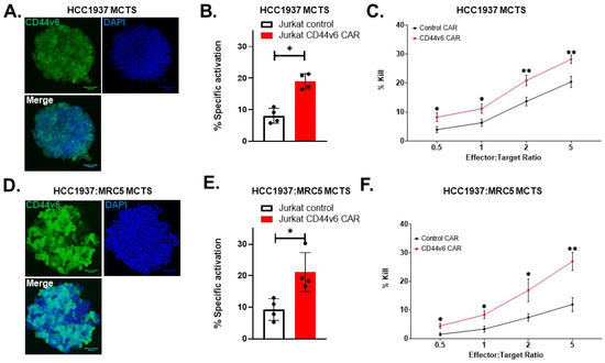 We then tested our novel CD44v6 CAR in a 3D TNBC multicellular tumor spheroid (MCTS) solid tumor model. The addition of fibroblasts to the MCTS allowed us to evaluate the contribution of cancer-associated fibroblasts and the tight stroma that can be seen in BC [19,20]. We first confirmed that CD44v6 is expressed in our 3D model (Figure 7A) and that CD44v6 CAR is effective in 3D models by using CD44v6 CAR-transduced Jurkat reporter cells (Figure 7B).