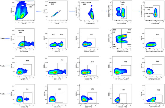 The gating strategy for cytometric analysis of T cells in PBMC samples. Threshold was set to cut off events with low CD45 staining. T cells were defined as CD3+ cells in the CD45highCD14− subset in the FSC-SSC lymphocyte gate; CD56+ T cells and CD56− T cells were defined in the CD3+ gate. SYTOX-Blue staining was used to detect dying cells. In CD3+, CD56−, and CD56+ subsets, the following cell fractions were determined: CD8+ and granzyme-B+, CD107a, naïve T cells (CCR7+CD45RA+), central memory (CM) T cells (CCR7+CD45RA−), effector memory (EM) T cells (CCR7−CD45RA−), and terminal effector memory T (TEMRA) cells (CCR7−CD45RA+). CD56+ cells were determined in the CD8+ gate. Surface expression of HLA-DR, CD16, NKG2D, PD-1, KIR2DL2/DL3, NKG2A, NKp30, CD57, NKG2C was assessed in T cells.