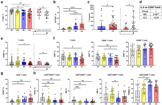 Main characteristics of the peripheral blood T lymphocytes from COVID-19 patients, convalescents, and healthy donors. (a) Proportion of T cells in lymphocyte population (CD14− CD45high) measured in the following comparison groups: healthy donors (HD) (n = 40), COVID-19 convalescent plasma donors (CCP) (n = 31), moderate severity (MS) (n = 28) and intensive care unit patients (ICU) (n = 29), and comparative analysis of the survivors (n = 15) and non-survivors (n = 14) from the ICU group. (b) Proportion of dead cells (HD (n = 11), CCP (n = 15), MS (n = 15), ICU (n = 9)). (c) Concentration of IL-6 (pg/mL) measured (MS (n = 24) and ICU (n = 31)), and comparative analysis of the survivors (n = 15) and non-survivors (n = 16) from the ICU group. (d) Spearman correlation between IL-6 concentration (pg/mL) and the percentage of CD56+ T cells in the MS and ICU groups. (e) Percentage of CD56+ cells among all T cells (HD (n = 40), CCP (n = 31), MS (n = 28), and ICU (n = 29)) and comparative analysis of the survivors (n = 15) and non-survivors (n = 14) from the ICU group. (f) Percentage of CD8+ cells among T cells in the HD (n = 29), CCP (n = 29), MS (n = 22), ICU (n = 20) groups. (g) Percentage of CD56+ cells among CD8+ T cells (HD (n = 20), CCP (n = 22), MS (n = 17), ICU (n = 17)). (h) Percentage of naïve, CM, EM, TEMRA cells among CD8+CD56+ T cells (HD (n = 17), CCP (n = 29), MS (n = 15), ICU (n = 17)). Red dots stand for the survivors, black—for the non-survivors. Significance of differences in the T cell percentages (a) between the comparison groups and between survivors and non-survivors was determined by one-way ANOVA with post hoc Tukey’s multiple comparisons test and by unpaired t-test, respectively. Differences in IL-6 concentrations (c) and the percentages of CD56+ cells between survivors and non-survivors (e) were analyzed by the Mann–Whitney test. Significance of data differences in (b,e–h) was determined by the Kruskal–Wallis test followed by Dunn’s multiple comparison test. Data are presented as mean (±SD). * p < 0.05, ** p < 0.01, *** p < 0.001.