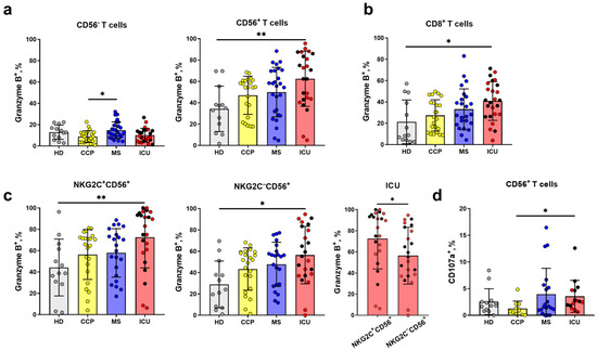 Intracellular production of granzyme B, the component of cytotoxic granules, in T cells is often considered as a significant parameter in the analysis of the antiviral immunity [49]. In our study, no significant changes in the intracellular granzyme B level were observed in the total T cell population during the progression of COVID-19 (Figure S3). Representative histograms of the cut-off for Granzyme B+ cells in each T cells subsets are shown in Figure S5. At the same time, the granzyme B content increased in NKT-like cell subset in the ICU group compared to the HD group, whereas the highest level of granzyme B was found in MS patients compared to ICU patients and CCP donors in the CD56− T cells (Figure 3a).