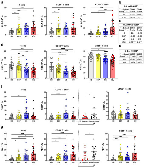 Analysis of activation and exhaustion of T cells. (a) The proportion of HLA-DR+ cells in the CD56− and CD56+ T cell subsets, and the total T cells (HD (n = 28), CCP (n = 29), MS (n = 25), ICU (n = 26)). (b) Spearman correlation between the IL-6 concentration (pg/mL) and the percentage of HLA-DR+ cells in the CD56− and CD56+ T cell subsets. (c) Spearman correlation between the percentages of HLA-DR+ and CD38+ cells in the CD56− and CD56+ T cell subsets. (d) Proportions of NKG2D+ cells in the CD56− and CD56+ subsets, and the total T cells (HD (n = 27), CCP (n = 35), MS (n = 23), ICU (n = 32)). (e) Spearman correlations between the IL-6 concentration (pg/mL) and the percentage of NKG2D+ cells in the CD56− and CD56+ T cell subsets. (f) Proportions of CD16+ cells in the CD56− and CD56+ cell subsets, and total T cells (HD (n = 21), CCP (n = 20), MS (n = 24), ICU (n = 20)). (g) Proportions of PD-1+ cells in the CD56− and CD56+ cell subsets, and the total T cells (HD (n = 28), CCP (n = 29), MS (n = 25), ICU (n = 27)). Red dots stand for the survivors, black—for the non-survivors. Significance of data differences was determined by the Kruskal–Wallis test followed by Dunn’s multiple comparison test. Difference in the CD16+ (f) and PD1+ cell percentages (g) between survivors and non-survivors was determined by the Mann–Whitney test. Data are presented as mean (±SD). * p < 0.05, ** p < 0.01, *** p < 0.001, **** p < 0.0001.
