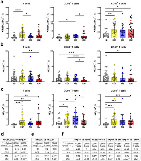In addition to inhibitory NK cell receptors, CD8+ T cells can express the activating natural cytotoxicity receptor NKp30 [33]. We found an increased proportion of NKp30+ cells in patients with COVID-19 among total T cells and in the CD56− and CD56+ T cell fractions compared to HD. The percentage of NKp30+ cells in the CD56− subset was the highest in the MS group (Figure 5c). Correlation analysis revealed an association of the NKp30 and KIR2DL2/3 expression in CD56− T cells in the ICU, MS, and CCP groups, but not in healthy donors (Figure 5d). Interestingly, the NKG2A+ cell proportions were positively correlated with NKG2D expression levels in the same subset of T cells in the MS and ICU groups (Figure 5e). An increase in NKp30+ cell percentage in the CD56+ subset in the ICU and MS groups was accompanied by an increase in the CM and EM T cell fractions, respectively (Figure 5f).