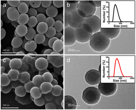 In this study, mesostructured polydopamine (MPDA) nanospheres were prepared as in a previous study [40] using F127 as a templet, TMB as a pore-enlarging agent, and dopamine as the source of nitrogen and carbon. The morphology of MPDA nanospheres and DS and TD-loaded MPDA were assessed by scanning electron microscopy (SEM) and transmission electron microscopy (TEM). Figure 1a showed that uniform MPDA nanospheres had an average particle size of 337 nm. The mesoporous structure of MPDA on the surface was clear in the observation of SEM. The TEM image also revealed that MPDA nanospheres possess a rough surface, similar to golf balls, with well-distributed pores exposed (Figure 1b). The mean particle diameter of DS-TD/MPDA was estimated to be 342 nm (Figure 1c,d), a bit larger than pure MPDA. Both of the SEM and TEM images displayed that the rough surface of nanospheres became blurred after coating with TD and DS. The average hydrodynamic diameter of MPDA and DS-TD/MPDA examined by dynamic light scattering (DLS) were similar to the measurements of TEM (inset of Figure 1b,d).
