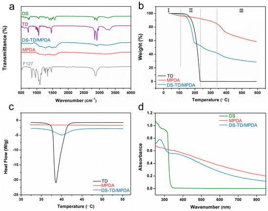 (a) FT-IR of F127, DS, TD, MPDA and DS-TD/MPDA. (b) TGA curves of TD, MPDA and DS-TD/MPDA. (c) DSC curves of TD, MPDA and DS-TD/MPDA. (d) UV-vis spectra of DS, MPDA and DS-TD/MPDA.