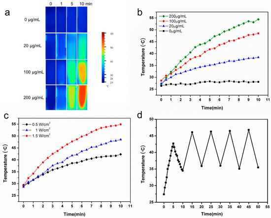 Photothermal effects of DS-TD/MPDA with laser irradiation (808 nm). (a) Thermal images of different concentrations DS-TD/MPDA in aqueous solution (1 W/cm2). (b) Temperature variation curve of different concentrations of DS-TD/MPDA (1 W/cm2). (c) Temperature variation curve of DS-TD/MPDA (100 µg/mL) of different power NIR laser irradiation. (d) Temperature variations of DS-TD/MPDA (100 µg/mL, 1 W/cm2) under NIR irradiation for five cycles.