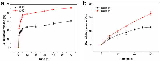 The amount of loaded DS was calculated to be 2.58%. To investigate the controlled release profiles for DS out of DS-TD/MPDA, thermal stimulation and NIR irradiation were performed. As shown in Figure 4a, 23.7% and 38.8% of DS release at 37 °C and 40 °C, respectively, occurred for the first 12 h. The percentage of DS rose to 30.8% and 45.9% within 72 h. In addition, the release of DS rapidly increased for 1 h after being triggered by NIR laser (Figure 4b). These results demonstrated that DS-TD/MPDA was effective in ensuring drug release through a photothermal response.