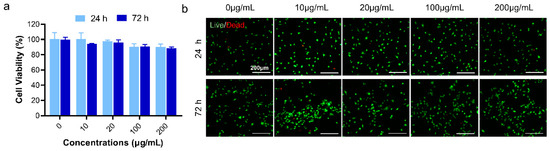 Cell viability assay of DS-TD/MPDA after 24 and 72 h incubated with ATDC5 cells. (a) CCK-8 assay. (b) Live/Dead staining images.