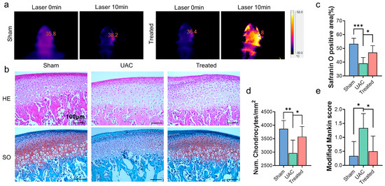 A unilateral crossbite (UAC) rat model was proved to effectively induce TMJ osteoarthritis in a previous study [51], which imitated one of the main causes of OA by loading abnormal biomechanical force on TMJs. Metal tubes were installed on the mandibular anterior tooth of Sprague-Dawley rats to alter the occlusion. Thus, TMJOA was developed with the intact structures of TMJ, facilitating the injection and residence of materials in articular space. The histology of cartilage tissues was evaluated by hematoxylin-eosin (H&E) staining and Safranin O-fast green staining 2 weeks after UAC generation (Figure 6b). We observed that the number of chondrocytes in condylar cartilage and the Safranin O positive area were significantly reduced in UAC rats compared with the other two groups (Figure 6c,d). The group treated with DS-TD/MPDA injection and laser exposure exhibited less cartilage degeneration, although there was little difference in comparison to the sham group. The modified Mankin score was chosen to evaluate the destruction of cartilage (Figure 6e). The modified Mankin score of the UAC group was obviously higher than the sham group and treated group (average of 1.2 vs. 0.3–0.4). In general, these findings indicated that the NIR-responsive DS-TD/MPDA drug-loaded platform alleviated cartilage degradation in temporomandibular joint osteoarthritis.