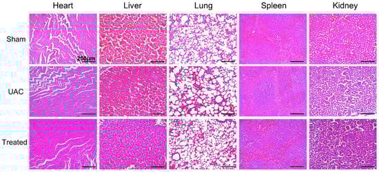 Histological images of major organs (heart, liver, lung, spleen and kidney) of rats with H&E staining.