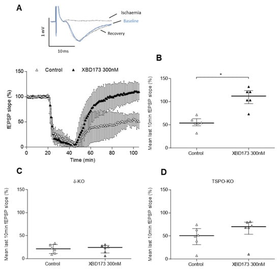 Effect of XBD173 on ischaemic experiments in WT, δ-KO, and TSPO-KO mice. (A) The insets show representative fEPSP slope traces during the baseline, the ischaemia, and the recovery periods in the presence of 300 nM XBD173. Each symbol represents the averaged fEPSP slopes (mean ± SD) and all responses were normalised to the baseline recorded for 20 min prior to the ischaemic period started for control and XBD173 300 nM in the WT genotype. (B–D) Scatter plots summarising the last 10 min of the 1 h recovery period after ischaemia, where median (IQR)% are represented. XBD173 at 300 nM significantly increased the fEPSP slope from the recovery in (B) the WT genotype (112(28)% vs. control 54(15)%, n = 6/6, p = 0.002). In contrast, (C) in the δ-KO genotype, the fEPSP slope from the recovery went back to baseline levels (24(16)% vs. control 21(19)%, n = 6/6, p = 0.132), as well as in the (D) TSPO-KO genotype (70(35)% vs. control 51(23)%, n = 6/6, p = 0.898). Statistically significant differences are marked with an * for p < 0.05 when the unpaired Mann–Whitney test was applied.