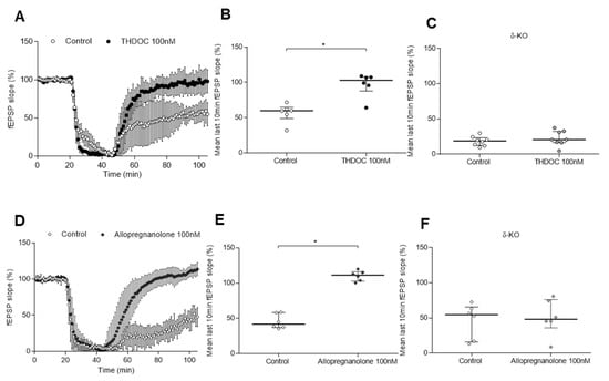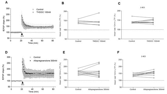 Effect of THDOC and allopregnanolone after LTP induction in WT and δ-KO mice. (A,D) Each symbol represents the averaged fEPSP slopes (mean ± SD) and all responses were normalised to the baseline recorded for 20 min prior to delivering the tetanic stimulus (arrow) before and after 60 min of (A) THDOC 100 nM and (D) allopregnanolone 100 nM exposure. (B,C,E,F) Connected scatter plots of the fEPSP slope from min 50 to 60 after high-frequency stimulation. THDOC 100 nM did not modify LTP either in (B) WT mice (146 ± 24% vs. control 145 ± 9%, n = 6/6, p = 0.562) or in (C) δ-KO animals (144 ± 11% vs. control 142 ± 11%, n = 9/8, p = 0.820). Moreover, after allopregnanolone administration in WT animals (162 ± 37% vs. control 158 ± 16%, n = 10/6, p = 0.695) and in (F) δ-KO mice (154 ± 18% vs. control 140 ± 9%, n = 9/9, p = 0.055), no significant LTP changes were evident. When the Wilcoxon test was applied, no significant differences were observed.