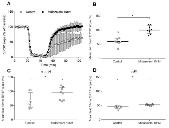 - Evans, M.S.; Viola-McCabe, K.E. Midazolam inhibits long-term potentiation through modulation of GABAA receptors. Neuropharmacology 1996, 35, 347–357. [Google Scholar] [CrossRef] [PubMed]