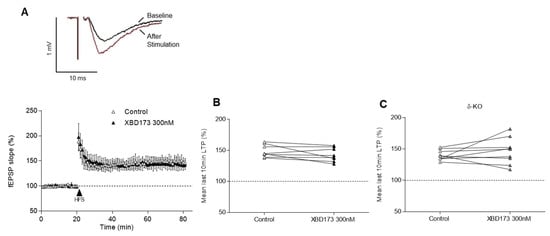 XBD173 applied at the same concentration that exerts protection against H/H excitotoxicity (300 nM) did not affect LTP (143 ± 11% vs. control 149 ± 10%, n = 8/8, p = 0.148) in WT animals (Figure 4A,B). Moreover, when applied to slices of δ-KO (147 ± 21% vs. control 140 ± 8%, n = 9/9, p = 0.496), the potentiation was not significantly modulated (Figure 4C). Hence, XBD173 300 nM does not produce detrimental effects on LTP in these genotypes.