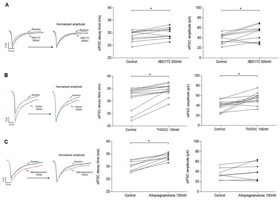 XBD173 application at 300 nM resulted in an increase in synaptic transmission; specifically, sIPSC’s decay time (left; 30 ± 2% vs. control 29 ± 2%, n = 10/6, p = 0.037) and amplitude (right; 50 ± 16% vs. control 39 ± 10%, n = 10/6, p = 0.049) were significantly augmented (Figure 6A). After administration of THDOC at 100 nM, both decay time (left; 34 ± 2% vs. control 31 ± 4%, n = 12/8, p = 0.001) and amplitude of sIPSC (right; 54 ± 12% vs. control 39 ± 10%, n = 12/8, p = 0.002) were significantly increased (Figure 6B). Exposure to allopregnanolone at 100 nM resulted in a significant prolonged sIPSC decay time (left; 34 ± 1% vs. control 30 ± 2%, n = 8/6, p = 0.008), whereas amplitude was not affected (right; 40 ± 17% vs. control 35 ± 11%, n = 8/6, p = 0.250) (Figure 6C).