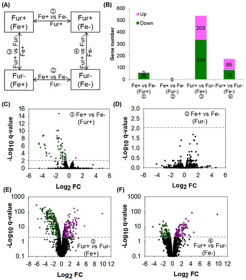 The DEGs identified between the Fur wild-type and knockout strains with or without iron supplied. (A) Experimental design of the four comparisons of transcriptomes. Fe+: with iron supplied in the medium; Fe−: without iron supplied in the medium; Fur+: Fur wild-type strain NCM3722; Fur−: Fur-knockout strain CY405. (B) The number of the DEGs identified in each of the four comparisons of transcriptomes. Up: up-expressed DEGs; Down: down-expressed DEGs. (C–F) Volcano map comparing the expression of genes in each of the four comparisons of transcriptomes. Horizontal lines point to q-value = 0.01. Pink dots indicate up-expressed DEGs. Green dots indicate down-expressed DEGs, and black dots indicate genes not differentially expressed (non-DEGs). (C,D) NCM3722 (C) or CY405 (D) grown in the medium with iron versus that without iron. (E,F) NCM3722 versus CY405 grown in the medium with (E) or without iron (F).