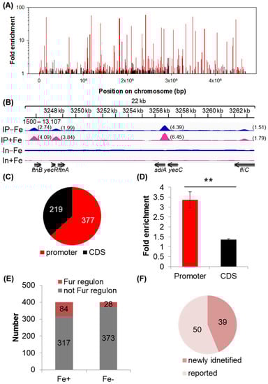 Identification of the Fur regulon by combined analysis of ChIP-seq and RNA-seq. (A) Distributions of the Fur-binding peaks identified in the genome. Red and black bars, respectively, represent peak signals identified in the promoter region (upstream of the start codon of a gene) and in the CDS region (coding sequence of a gene). The parameter of fold enrichment of the peak indicates the strength of the ChIP-seq signal. (B) Examples of enlarged peaks identified in the chromosome. This image shows a part of the Fur-binding profiles in the chromosome. IP−Fe/IP+Fe: ChIP-seq result in the growth condition without (IP−Fe) or with iron (IP+Fe); In−Fe/In+Fe: Input control result in the growth condition without (In−Fe) or with iron (In+Fe). ‘1500-13,107′ indicates the data range of the scale. Numbers in parentheses show values of fold enrichment of the peaks. (C) Peak numbers identified in the promoter region and in the CDS region. (D) Fold enrichment of the binding peaks. The fold enrichment of the binding peaks was expressed as the average ± SEM (n = 377 in promoter region; n = 219 in CDS region). ** indicates p ≤ 0.01 by Student’s t-test. (E) The number of the transcriptional units that were identified to be controlled by Fur directly out of the 401 transcriptional units bound by Fur. Fe+: with iron; Fe−: without iron. (F) The size of the Fur regulon identified combining the two conditions with or without iron.