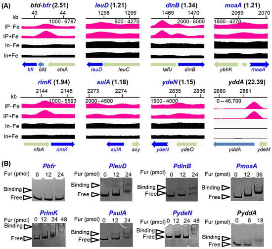 Figure 3A illustrated several exampled binding peaks identified in this work, including Fur regulon genes that were newly identified and reported. The fold enrichment of these peaks ranged from 1.15 to 22.39, covering most of the peaks carrying weak to strong binding signals. To further substantiate the findings of our ChIP-seq, several of the Fur bindings to identify promoters, especially those with weak binding peaks, were further validated via in vitro electrophoretic mobility shift assay (EMSA) (Figure 3B). Thus, we expanded the Fur regulon greatly.