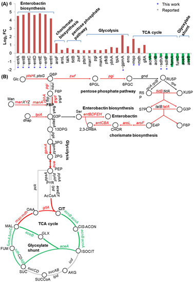 We mapped these genes together with the genes functioning in enterobactin biosynthesis to their metabolic pathways (Figure 6B). As shown in the map, enterobactin biosynthesis tightly connected the upper part of glycolysis, the pentose phosphate pathway, and the pathway of the chorismate biosynthesis. Interestingly, DEGs involved in these processes all negatively responded to Fur directly or indirectly. Since enterobactin biosynthesis needed the carbon skeletons generated in these carbon metabolism pathways, it was reasonable that these genes responded to Fur in an orchestral way. The mechanisms of the genes under the indirect regulation of Fur still needed to be discovered.
