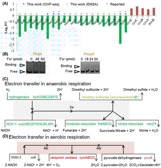 DEGs functioning in electron transfer of aerobic and anaerobic respiration. (A) Fold changes in DEGs functioning in aerobic and anaerobic respirations in the transcriptome comparison of CY405 versus NCM3722. Green bars showed DEGs activated by Fur (directly or indirectly), and red bars showed DEGs repressed by Fur (directly or indirectly). DEGs that directly responded to Fur identified by ChIP-seq in this work were marked by stars in dark blue, those identified by EMSA in panel (B) were marked by stars in orange, and those identified in the literature were marked by stars in gray. (B) Identification of Fur-binding promoters by EMSA. The promoter fragment of frdA (PfrdA) or nuoA (PnuoA) was incubated with a purified Fur protein, as described in the Materials and Methods. Free and binding probes were respectively indicated by triangles next to the image. At least two independent repeats were performed for each assay, and one representative image is shown. (C) DEGs functioning in anaerobic respiration were mapped to the electron transfer chains. Electrons could be transferred from NADH to one of the three substrates (fumarate, nitrate, and dimethyl sulfoxide). The enzymes that functioned in this process included NDH-1, fumarate reductase, nitrate reductase, and sulfoxide reductase. Alternatively, electrons could be transferred from H2 to fumarate or dimethyl sulfoxide. The enzymes that functioned in this process included hydrogenase, fumarate reductase, and sulfoxide reductase. (D) The DEGs functioning in aerobic respiration were mapped to the electron transfer chains. Electrons could be transferred from NADH to O2 or from pyruvate to O2. The enzymes that functioned in this process included NDH-2, pyruvate dehydrogenase, and cytochrome o ubiquinol oxidase. In panels (C,D), DEGs repressed by Fur are shown in red (directly) and light red (indirectly). DEGs activated by Fur are shown in green (directly) or olive green (indirectly). Non-DEGs are shown in black.