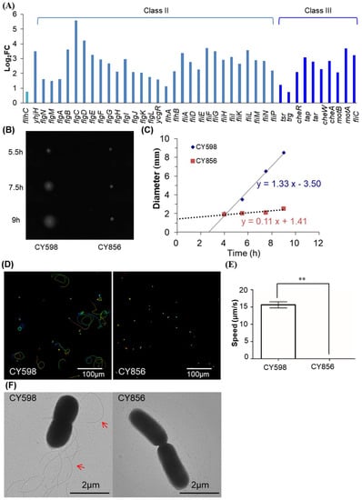Characterization of Fur regulation on motility. (A) Fold changes in DEGs functioning in motility in the transcriptome comparison of NCM3722 versus CY405. The gene of flhC belonged to class I in the hierarchy of the flagellar cascade. (B) Swimming zones of the two strains on soft-agar plates after incubation at 37 °C for different lengths of time. CY598 is the Fur wild-type strain of NCM3722 with the mutated fliC fixed to the wild-type fliC. CY856 is the Fur-knockout strain derived from CY598. Two independent experiments were tested, and one representative image is shown. (C) Swimming speed of the two strains on soft-agar plates. The diameter of the swimming zone in (B) was plotted against time. The slope of the linear fitting indicates swimming speed in unit of mm/h. (D) The trajectories of the single-cell movements of the two strains in liquid culture. The rainbow colors correspond to the tracking time. (E) Swimming speed of the two strains grown in liquid culture. The swimming speed was expressed as the average ± S.D., which was calculated from 70 to 140 individual trajectories combined from two independent experiments. ** indicates p ≤ 0.01 by Student’s t-test. (F) Flagella of single cells of the two strains. One representative image of two independent experiments is shown. Red arrows mark representative flagella.