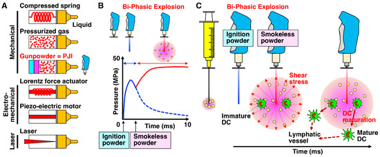 Various types of needle-free jet injectors with different driving forces. (A) In contrast to the typical needled syringe, various types of needle-free injectors with different driving forces have been developed. These needle-free injectors possess several advantages in that they are easy to operate, are dose-sparing, do not present the issue of cross-contamination by re-use, do not cause needle-stick injuries and are suitable for large-scale vaccination [38,39,40,41]. (B) Among them, a new needle-free pyro-drive jet drive injector (PJI) is a unique device that utilizes two different types of explosives, ignition and smokeless powders and can control the penetration depth and wide dispersion of delivery [42]. (C) The high-speed camera analysis in a polyurethane gel revealed that the liquid rapid jet creates a hole in the gel upon the initial explosion caused by the ignition powder, penetrates and then ceases the penetration [42]. Thereafter, upon the second explosion induced by the smokeless powder, the liquid jet disperses in a concentric circle around the end of the formed hole. Shear stress generated by rapid jet velocity via the PJI accelerates the uptake of plasmid DNA and, consequently, its protein expression, followed by the induction of DC maturation and migration through lymphatic vessels [43].