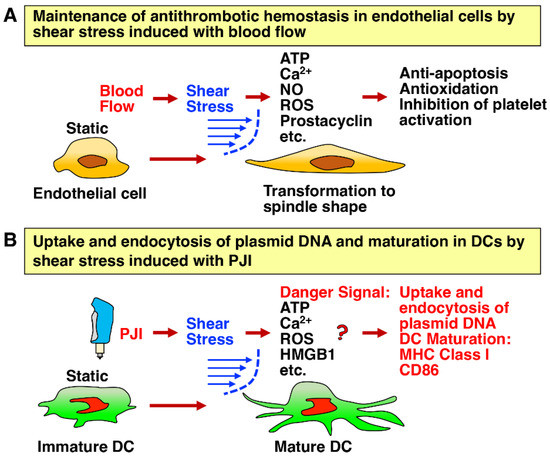 Shear stress generated by rapid jet velocity via the PJI is important for uptake and endocytosis of plasmid DNA and presumably DC maturation. (A) Blood flow generates shear stress applied tangentially or parallel to the surface of endothelial cells [57]. Endothelial cells are critical sensors in response to shear stress, which physiologically maintains their antithrombotic homeostasis. (B) Similarly, shear stress generated by rapid jet velocity of the PJI accelerates the uptake and endocytosis of plasmid DNA, resulting in augmented protein expression in DCs [43,58,59]. Moreover, shear stress presumably plays an important role in the activation of innate immunity, including the induction of DC maturation, leading to the establishment of adaptive immunity [61,62,63].