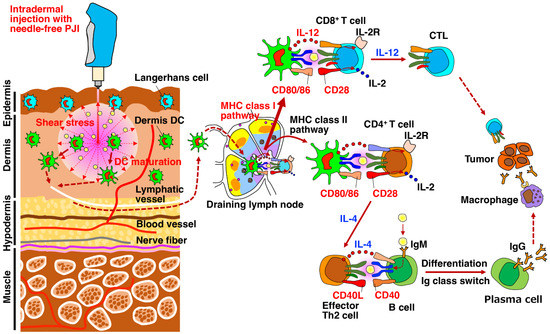 Collectively, the possible molecular mechanism whereby the PJI augments the antitumor effects of vaccination with OVA-expression plasmid is presumably considered as follows (Figure 5). The intradermal injection of OVA-expression plasmid using the PJI generates shear stress via its high jet velocity, which induces the wide dispersion of the DNA solution in the skin (Figure 2C) [43]. Then the shear stress accelerates the uptake and endocytosis of plasmid DNA into the nucleus of the skin cells, including DCs. Consequently, the shear stress increases the target OVA protein expression and presentation of the OVA protein-processed peptides via the MHC class I pathway in DCs. Simultaneously, the shear stress presumably provokes danger signals such as HMGB1 [61], ATP [62] and ROS [63], which together with adjuvant activity of the plasmid DNA induce the maturation of DCs with upregulation of CD86 [67] and CCR7 [68], followed by the migration into the draining lymph nodes. Then mature DCs presenting OVA peptides on the MHC class I stimulate naive CD8+ T cells and consequently generate effector CTLs [69]. On the other hand, the phagocytosis of dead cells expressing OVA or OVA protein by immature DCs activates the MHC class II pathway, subsequently upregulates CD86 and CCR7 on the DCs and induces their migration into the draining lymph nodes [69]. There, mature DCs presenting OVA peptides on the MHC class II stimulate naive CD4+ T cells and consequently generate effector CD4+ T cells, such as Th2 cells, resulting in the stimulation of OVA-specific B cells and differentiation into antibody-producing plasma cells. Thus, the intradermal injection of OVA-expression plasmid using the PJI efficiently augments both antitumor cellular and humoral immunity in an antigen-specific manner.