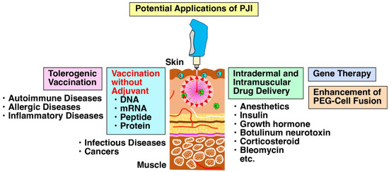 PJI is a versatile device having a variety of possible applications in many research fields. In addition to vaccination of plasmid DNA, mRNA, peptide and protein without any adjuvants, the PJI can be applied to a variety of research fields as a tool for efficient delivery, such as tolerogenic vaccination [74], intradermal and intramuscular delivery of drugs [39,40,73], gene therapy [75,76] and enhancement of PEG-cell fusion [51].
