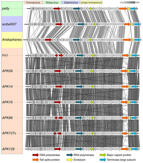 Comparison of the genome sequences of phages APK09, APK14, APK16, APK86, APK127v, APK128, and genomes of other representatives of Beijerinckvirinae subfamily infecting A. baumannii. The percentage of sequence similarity is indicated by the intensity of the gray color shown in the legend in the upper right corner. Vertical blocks between analyzed sequences indicate regions with at least 21% similarity.