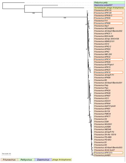 The comparison of nucleotide intergenomic similarity (Figure S1) and the results of the phylogenetic analysis of conservative proteins (Figure 2) also clearly indicated that the novel A. baumannii phages belong to the genus Friunavirus.