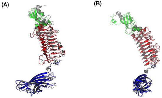 Superposition of monomers of TSD APK09_gp48 (colored as in Figure 11C) (A) and TSD of Acinetobacter phage AM24 (PDB ID: 5W5P) (B) colored in gray. Two orientations are related by a rotation on 90° about vertical axis.