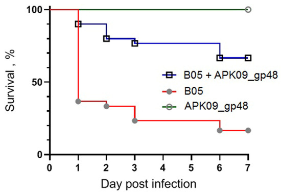 The infectious dose of 3 × 105 CFU of A. baumannii B05, resulting gradual reduction in larval survival rates over the 7-day experiment, was selected. At the end of the 7-day follow-up period, 83.3% of the larvae died after inoculation with A. baumannii B05. At the same time, a single dose of enzyme APK09_gp48 injected together with the bacterial suspension significantly inhibited A. baumannii-induced death of G. mellonella larvae in a time-dependent manner (Figure 13). The injection of 2 µg of depolymerase with the infecting bacteria resulted in 66.7% survival of the larvae. Protection of the G.mellonella larvae by the depolymerase APK09_gp48 was found to be statistically significant (p-values < 0.0001).