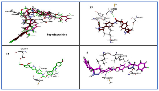 We used in silico molecular docking simulation models to test compounds 8, 12, and 15 against the EGFR and BRAFV600E mutated (BRAFm) [54] proteins to ascertain the binding affinity and mechanisms of inhibition of the most potent compounds (12,15) and the least potent compound (8) against potential cellular targets of this class. By comparing the cellular macromolecules used in this study, the outcomes were very hopeful. Using the Discovery Studio program, molecular docking studies of the crystal structures and binding modes of the EGFR (PDB ID: 1M17) [55] and BRAFV600E (BRAFm; PDB ID: 3OG7) [56] were carried out. The docking model of the co-crystallized ligand (erlotinib) within the active site of the EGFR had a docking score (S) of −7.6 kcal/mol and an RMSD of 1.36 A upon re-docking within the active site of the EGFR. Using this reliable docking model, we investigated how compounds 8, 12, and 15 might bind to the EGFR active site. Compound 12 outperforms erlotinib in terms of docking scores (−7.9 kcal/mol). By analyzing the ideal docking pose for hybrids 8, 12, and 15, as displayed in Figure 4, all three of the hybrids were connected to the vital EGFR amino acid Met769 by a regular hydrogen bond acceptor via carbonyl oxygen. Erlotinib’s pyrimidine nitrogen and Met769 exhibit this hydrogen bond as well; see Figure 4. Additionally, compound 12 demonstrated a second hydrogen-binding interaction with LYS 721 in addition to the carbon hydrogen, as well as pi-sigma interactions with the amino acid residues Glu 780, Leu 694, and Val 702 (Figure 5 and Figure 6), which agrees with the EGFR inhibition assay’s in vitro results.