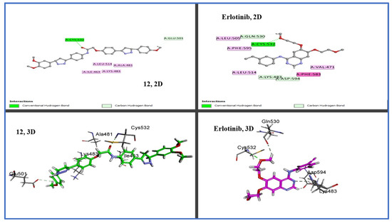 Here, the most active hybrid 12 was docked once more within the active site of BRAFm. It is interesting to note that test hybrid 12 had a similar docking score (−7.2 kcal/mol) to erlotinib (−7.3 kcal/mol). A visual inspection of the 2D drawing of the molecular docking process for compound 12 used in the molecular docking studies, as shown in Figure 7, revealed good fitting within the BRAFm active site with a number of hydrophobic and hydrogen-bonding interactions. Furthermore, interactions between compound 12 and the active site of BRAF revealed one typical H- bond with Cys532, like with erlotinib; see Figure 6.