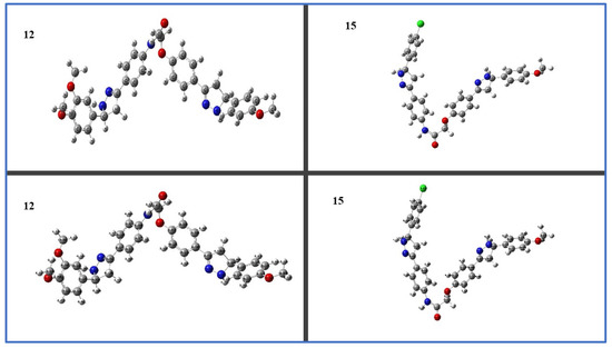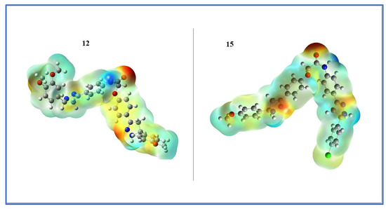 The use of molecular electrostatic potential plots can help one to understand how drug-like substances interact with their environment [63]. The optimized structure produces the three-dimensional reactive sites that are electrophilic and nucleophilic. The various shades signify various molecular surface electrostatic potential. In order of decreasing electrostatic potential, the colors are red, orange, yellow, green, and blue [64]. A red color surface indicates an extremely electron-rich (nucleophilic) site, a blue color surface is an electron-deficient (electrophilic) site, and a green color surface reveals an electrically neutral region. It is anticipated that the binding site in the receptor will have opposing electrostatic potential values [65]. Binding interactions are caused by variations in the ligand electrostatic potential on its surface. The molecular electrostatic potential study thus offers details on the ligand strategy and the nature of binding with biological receptors. Figure 10 shows the electrostatic potential surface of the title compounds 12 and 15.